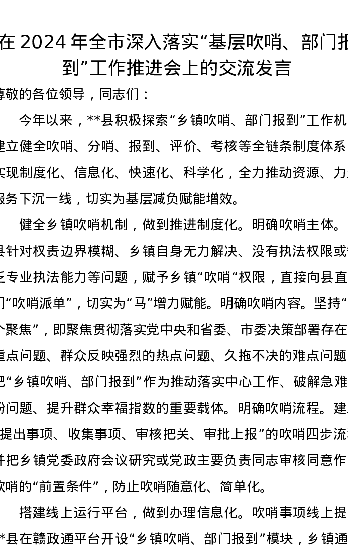 在2024年全市深入落实“基层吹哨、部门报到”工作推进会上的交流发言