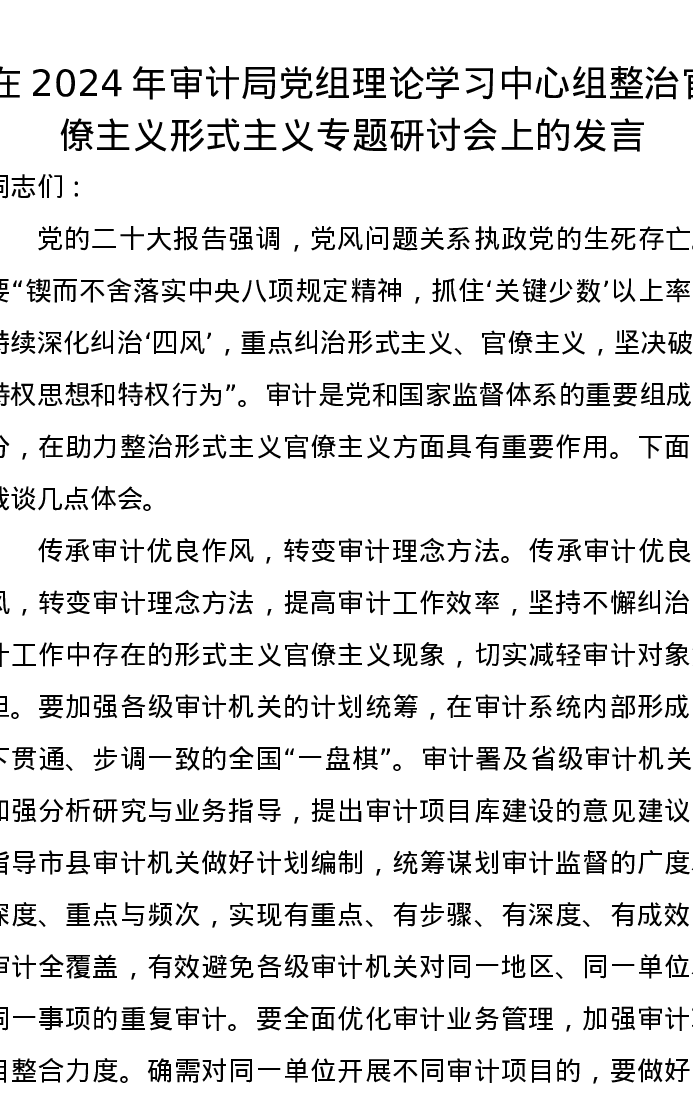 在2024年审计局党组理论学习中心组整治官僚主义形式主义专题研讨会上的发言