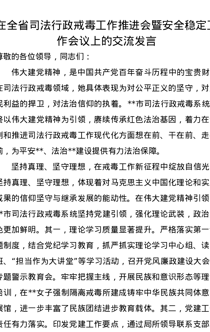 在全省司法行政戒毒工作推进会暨安全稳定工作会议上的交流发言