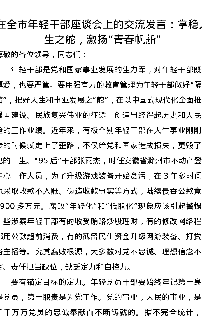 在全市年轻干部座谈会上的交流发言:掌稳人生之舵,激扬“青春帆船”