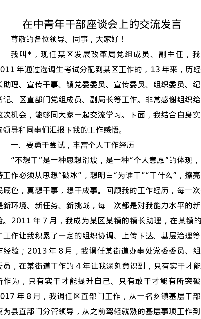 在中青年干部座谈会上的交流发言