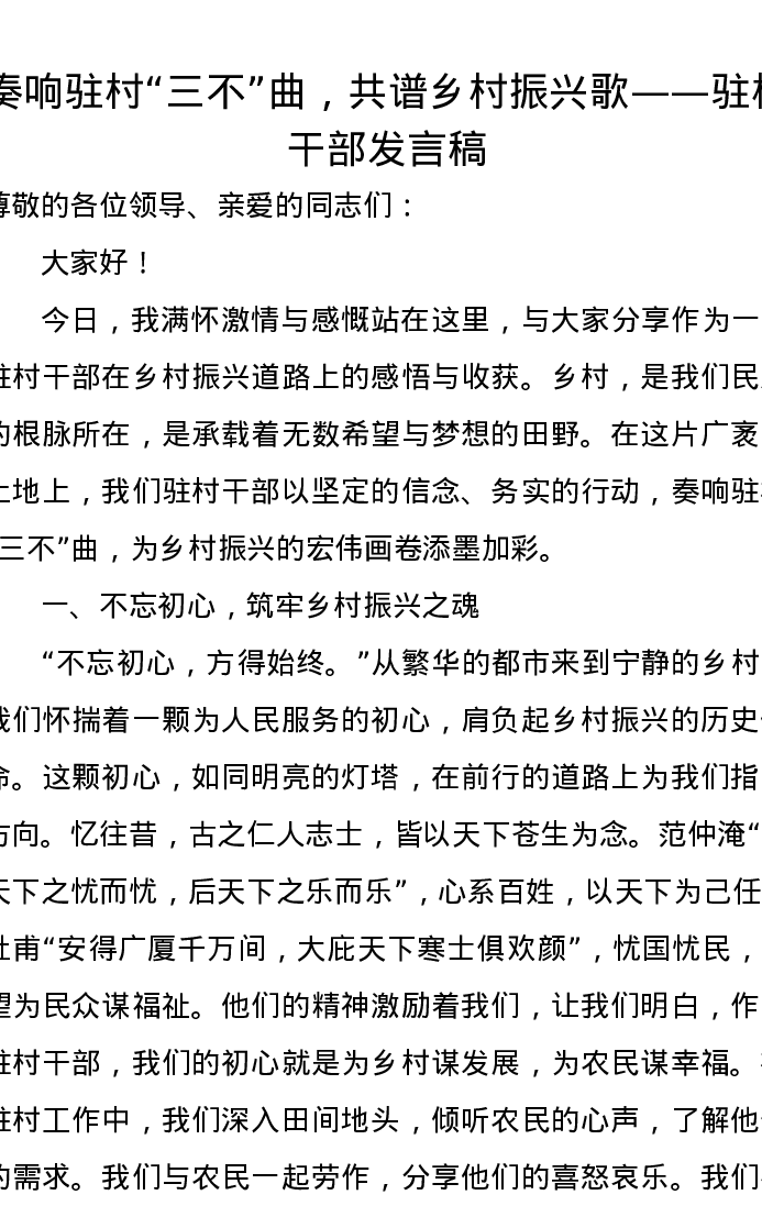 奏响驻村“三不”曲,共谱乡村振兴歌——驻村干部发言稿