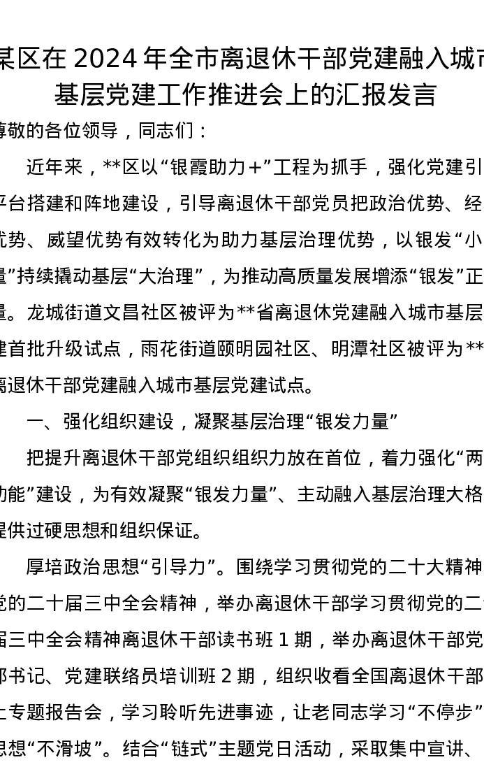某区在2024年全市离退休干部党建融入城市基层党建工作推进会上的汇报发言