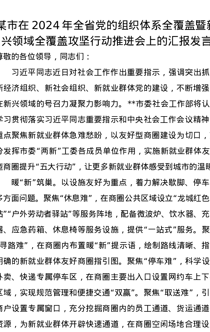 某市在2024年全省党的组织体系全覆盖暨新兴领域全覆盖攻坚行动推进会上的汇报发言