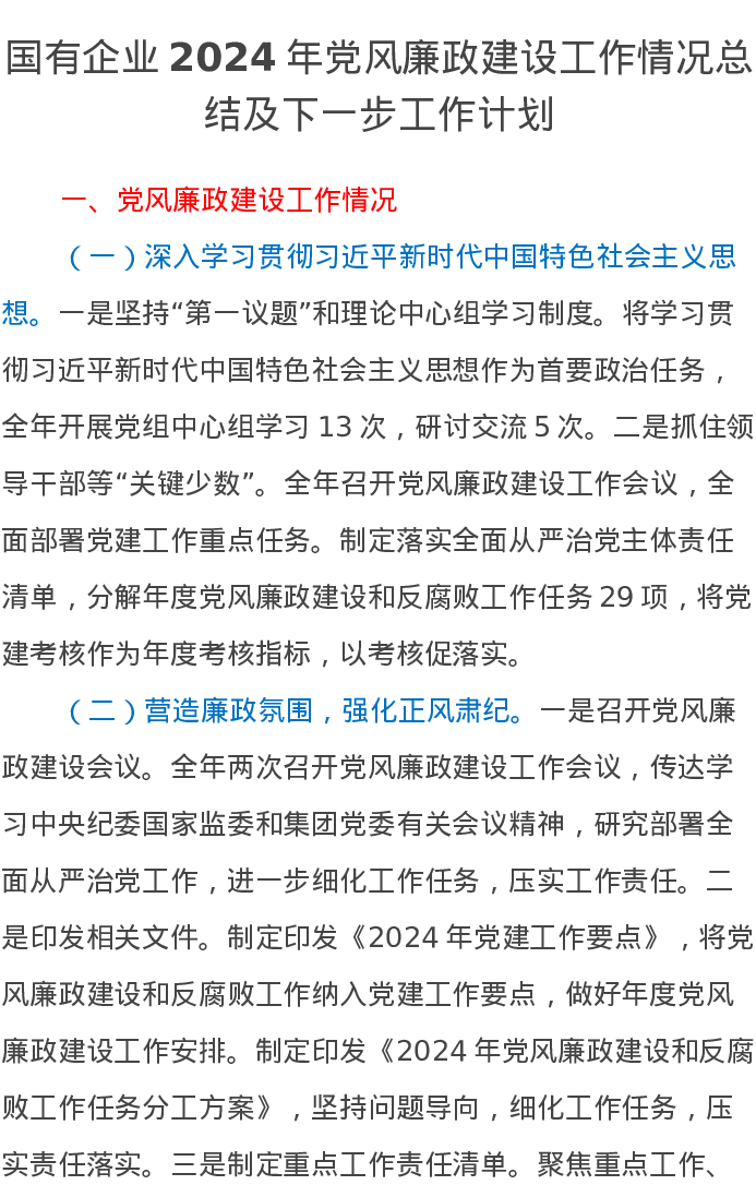 国有企业2024年党风廉政建设工作情况总结及下一步工作计划
