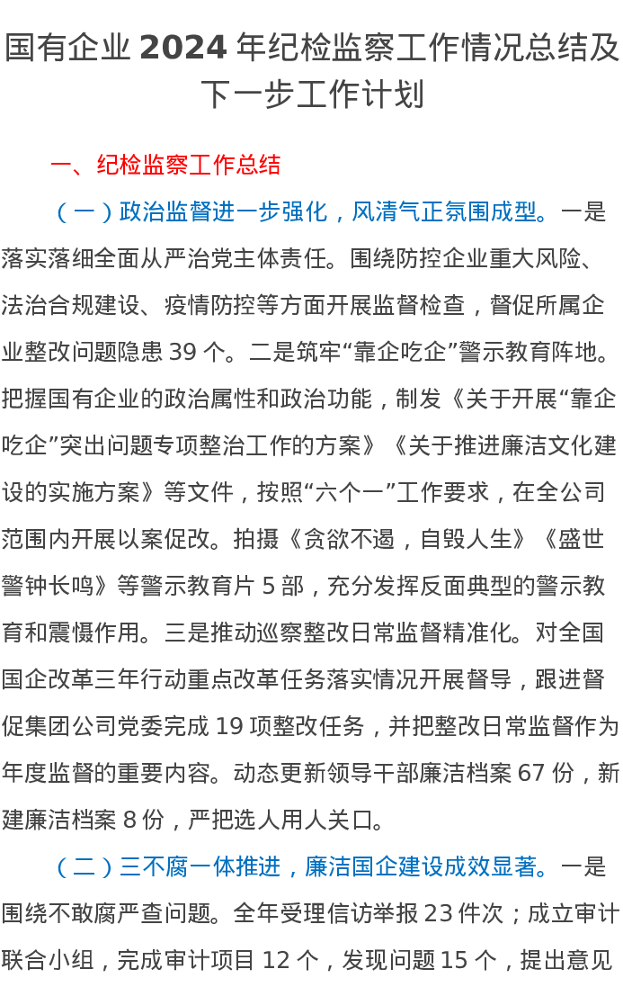 国有企业2024年纪检监察工作情况总结及下一步工作计划