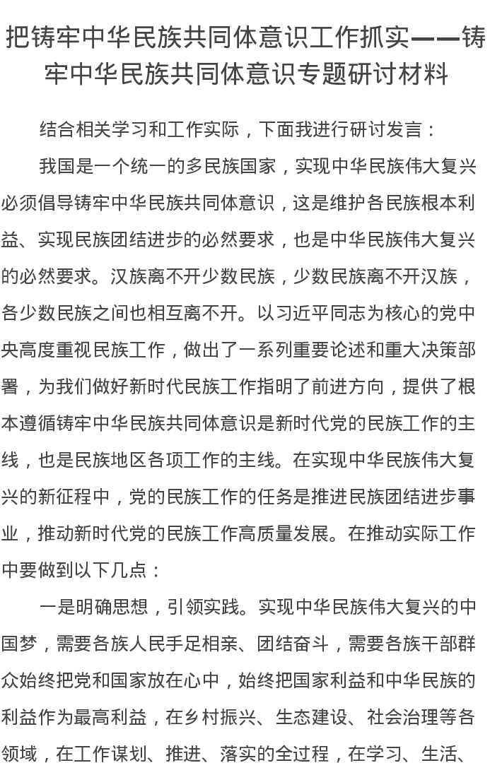 把铸牢中华民族共同体意识工作抓实——铸牢中华民族共同体意识专题研讨发言材料