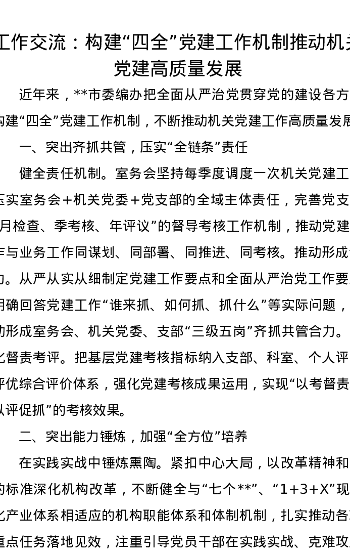 工作交流发言:构建“四全”党建工作机制,推动机关党建高质量发展