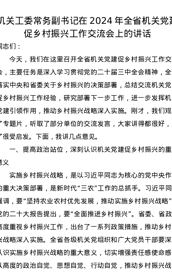 机关工委常务副书记在2024年全省机关党建促乡村振兴工作交流会上的讲话