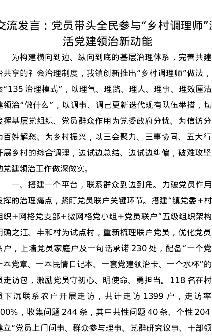 交流发言:党员带头全民参与“乡村调理师”激活党建领治新动能