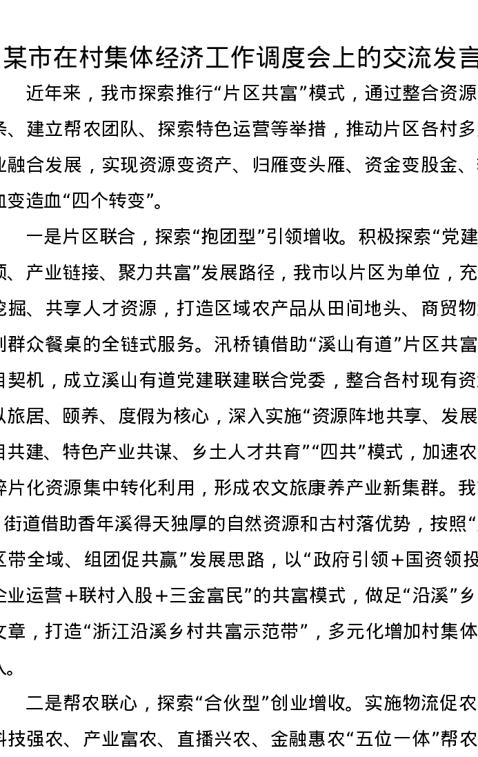 某市在村集体经济工作调度会上的交流发言