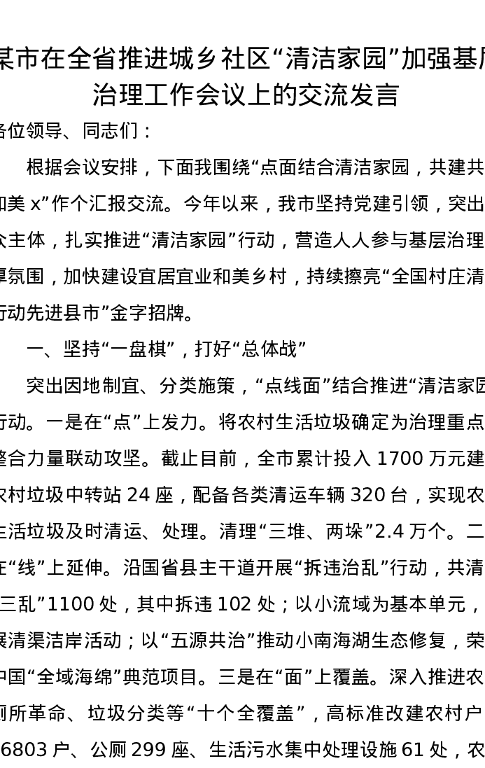 某市在全省推进城乡社区“清洁家园”加强基层治理工作会议上的交流发言