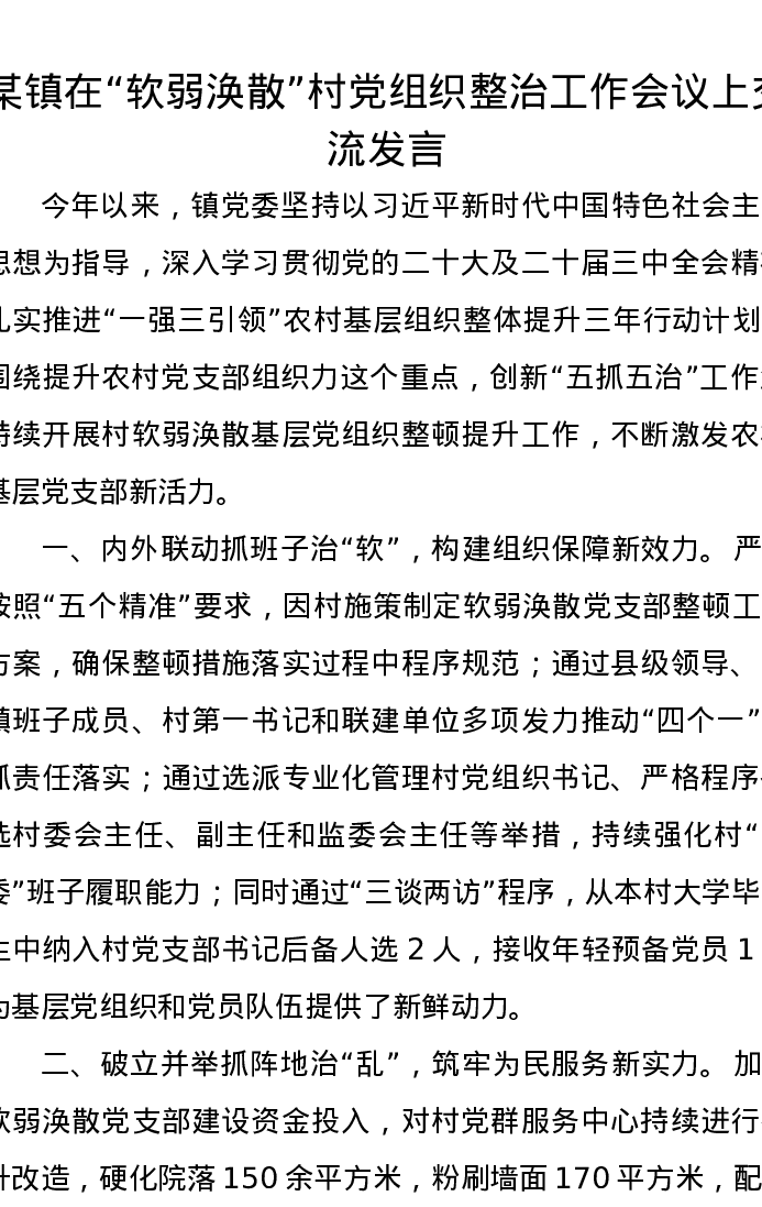 某镇在“软弱涣散”村党组织整治工作会议上交流发言