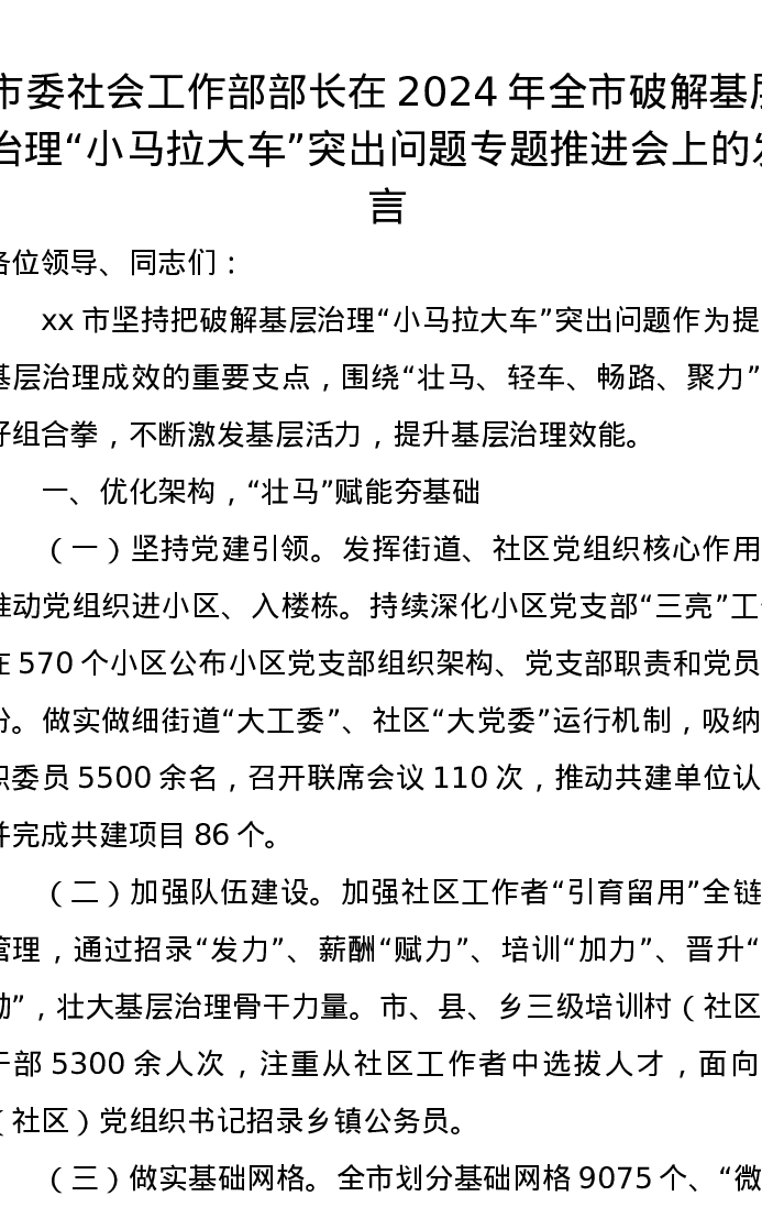 市委社会工作部部长在2024年全市破解基层治理“小马拉大车”突出问题专题推进会上的发言