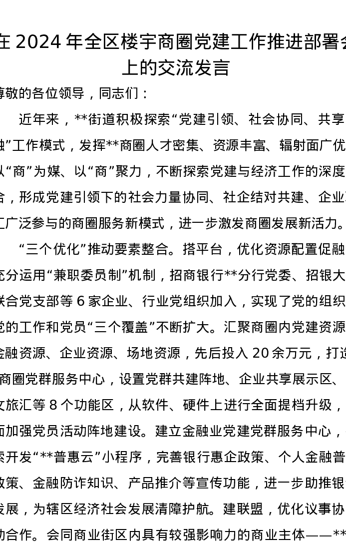 在2024年全区楼宇商圈党建工作推进部署会上的交流发言