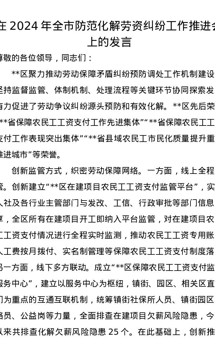 在2024年全市防范化解劳资纠纷工作推进会上的发言