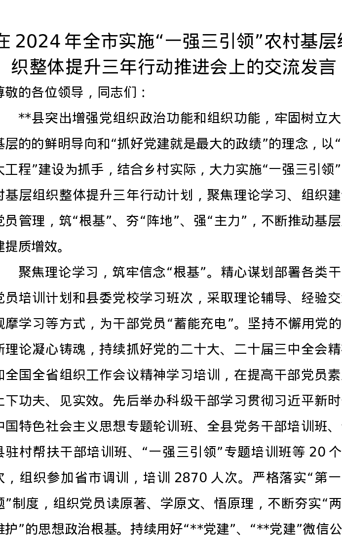 在2024年全市实施“一强三引领”农村基层组织整体提升三年行动推进会上的交流发言