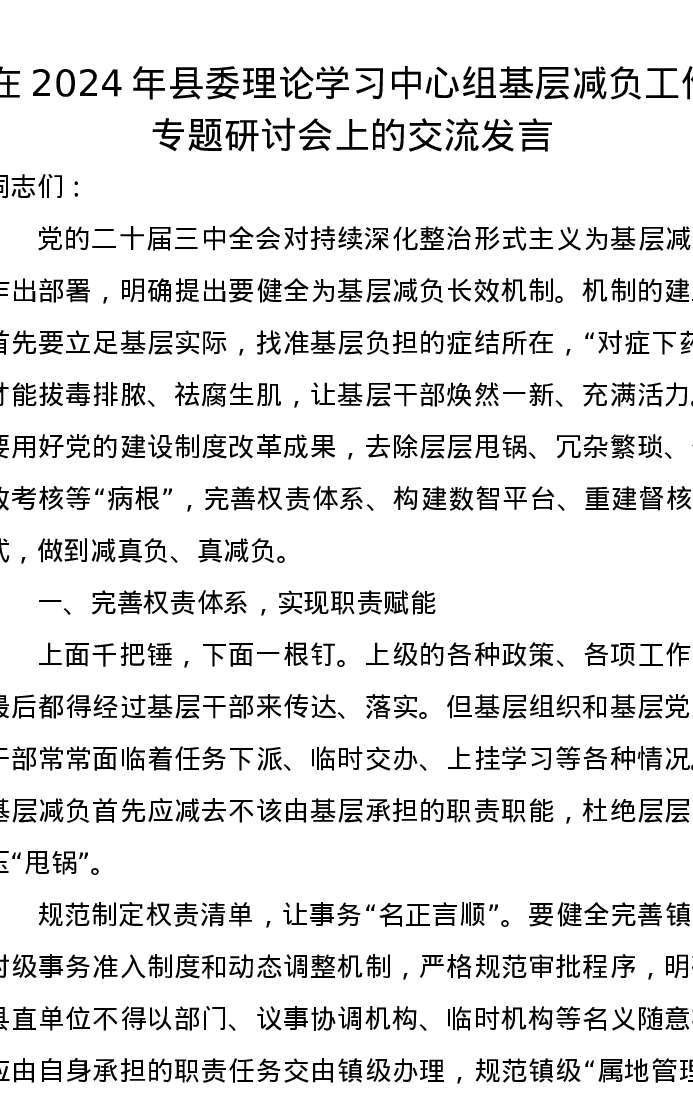 在2024年县委理论学习中心组基层减负工作专题研讨会上的交流发言
