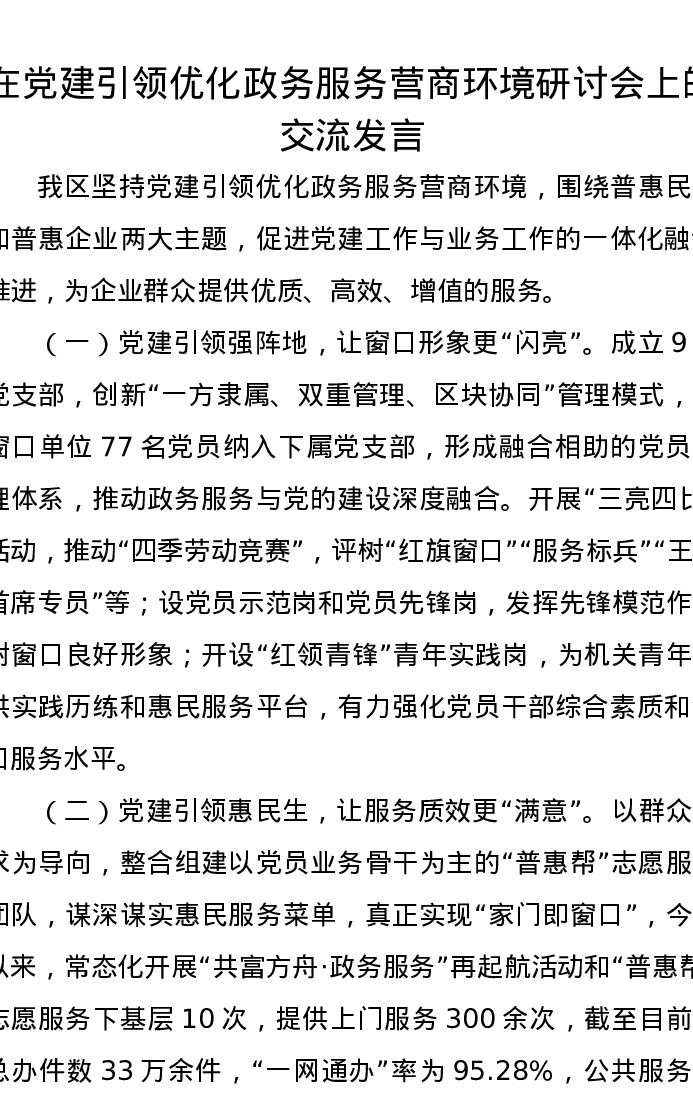 在党建引领优化政务服务营商环境研讨会上的交流发言