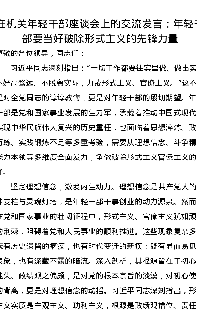 在机关年轻干部座谈会上的交流发言:年轻干部要当好破除形式主义的先锋力量