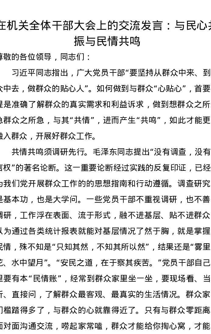 在机关全体干部大会上的交流发言:与民心共振,与民情共鸣