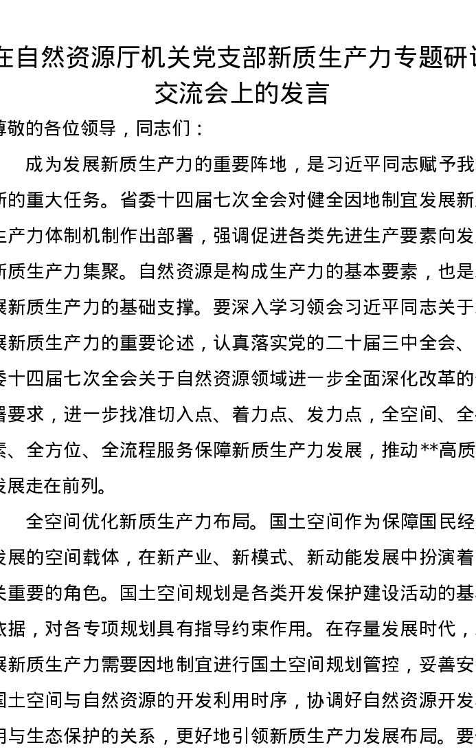在自然资源厅机关党支部新质生产力专题研讨交流会上的发言