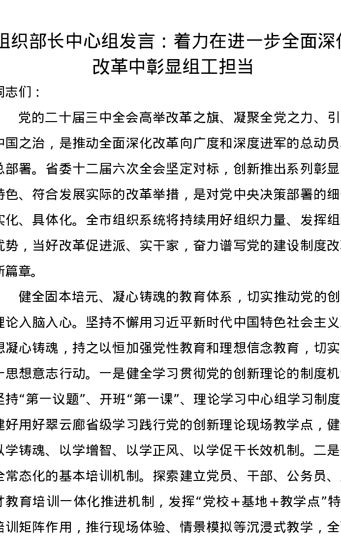 组织部长中心组发言:着力在进一步全面深化改革中彰显组工担当