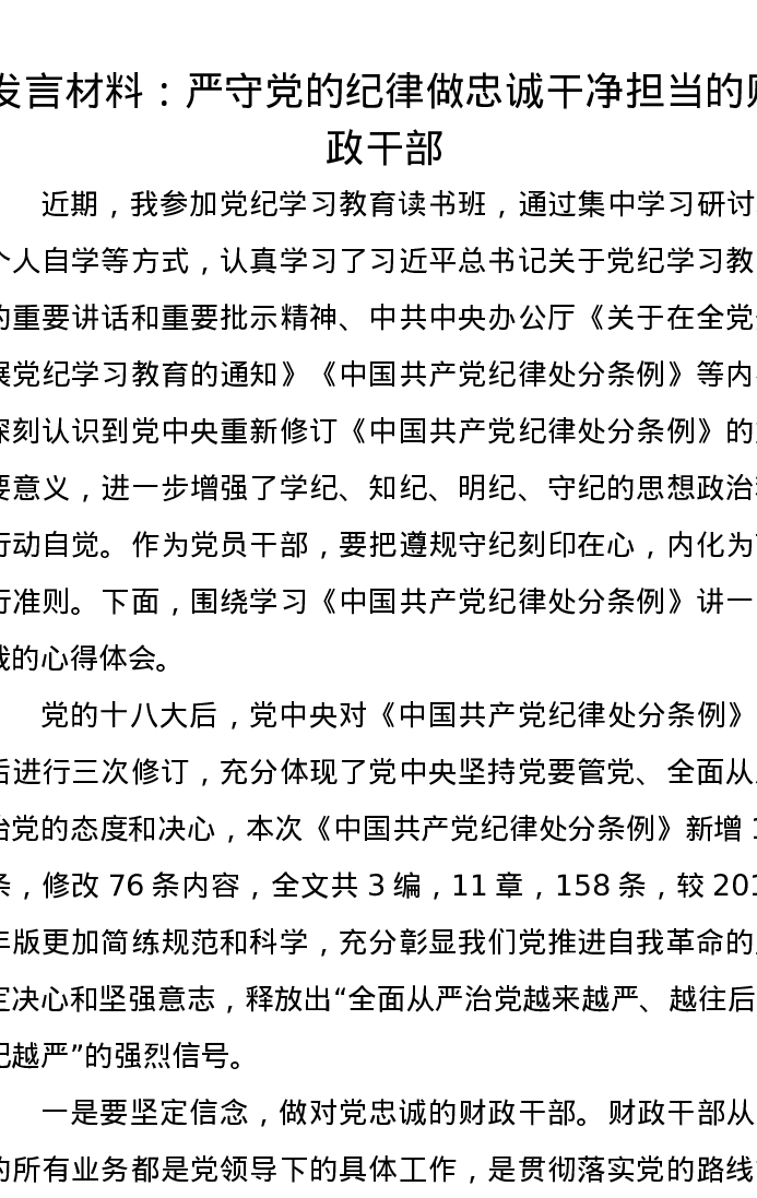 发言材料:严守党的纪律做忠诚干净担当的财政干部