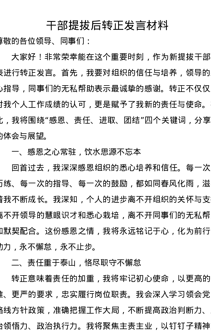 干部提拔后转正发言材料