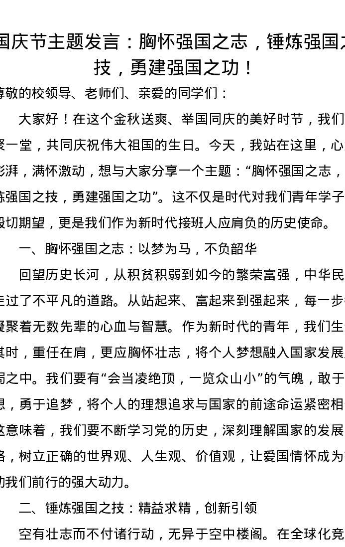 国庆节主题发言:胸怀强国之志,锤炼强国之技,勇建强国之功!