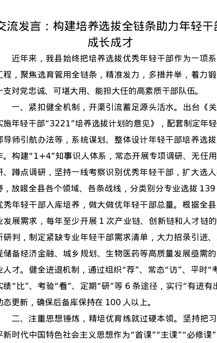 交流发言:构建培养选拔全链条助力年轻干部成长成才
