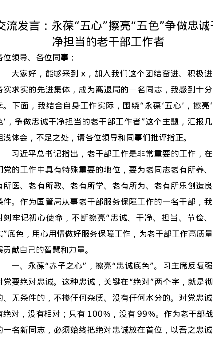 交流发言:永葆“五心” 擦亮“五色” 争做忠诚干净担当的老干部工作者