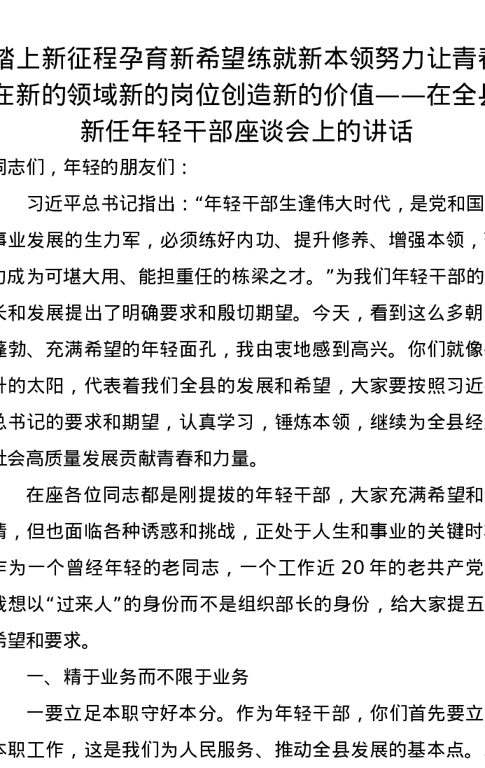踏上新征程 孕育新希望 练就新本领 努力让青春在新的领域新的岗位创造新的价值——在全县新任年轻干部座谈会上的讲话