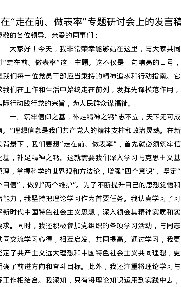 在“走在前、做表率”专题研讨会上的发言稿
