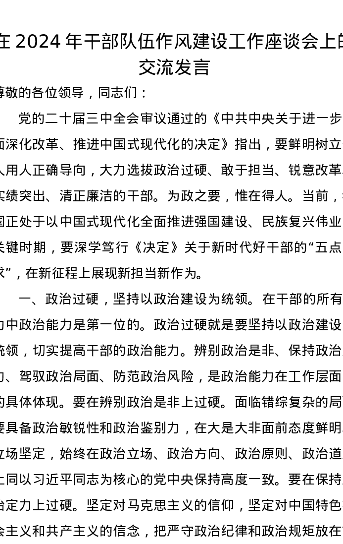 在2024年干部队伍作风建设工作座谈会上的交流发言
