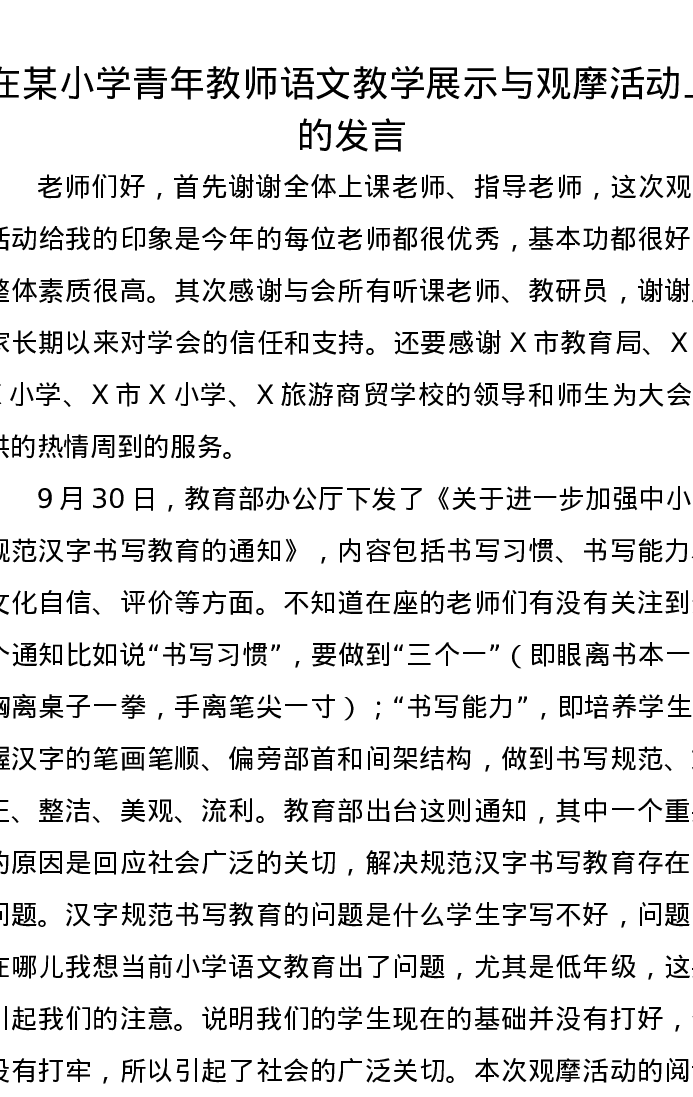 在某小学青年教师语文教学展示与观摩活动上的发言
