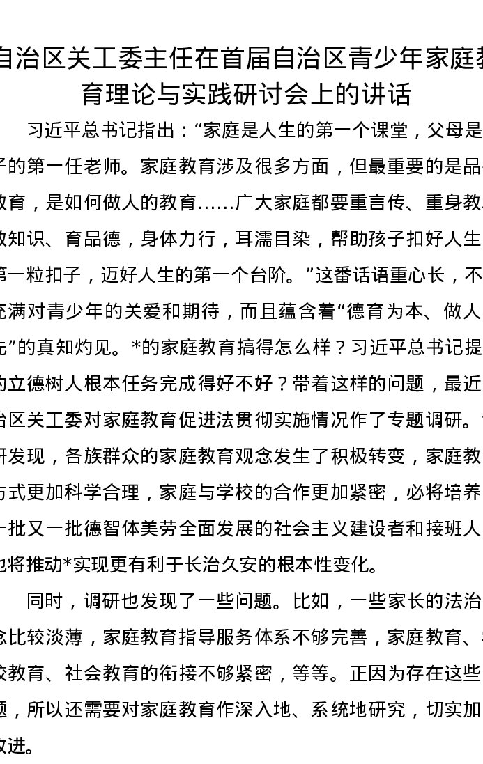 自治区关工委主任在首届自治区青少年家庭教育理论与实践研讨会上的讲话