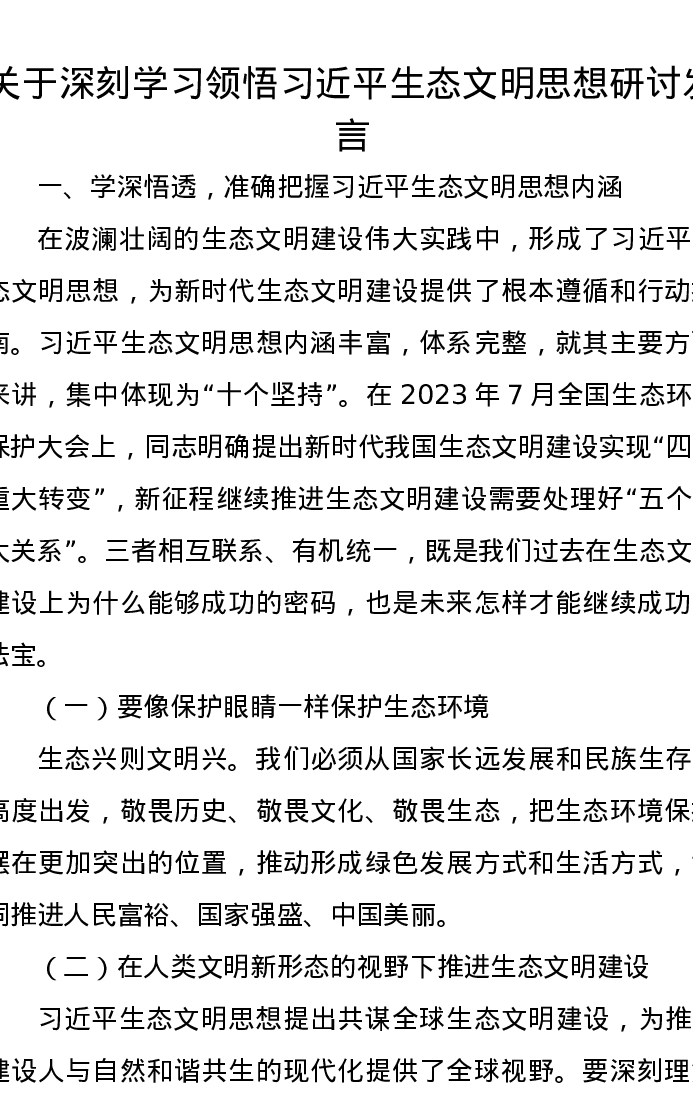 关于深刻学习领悟习近平生态文明思想研讨发言