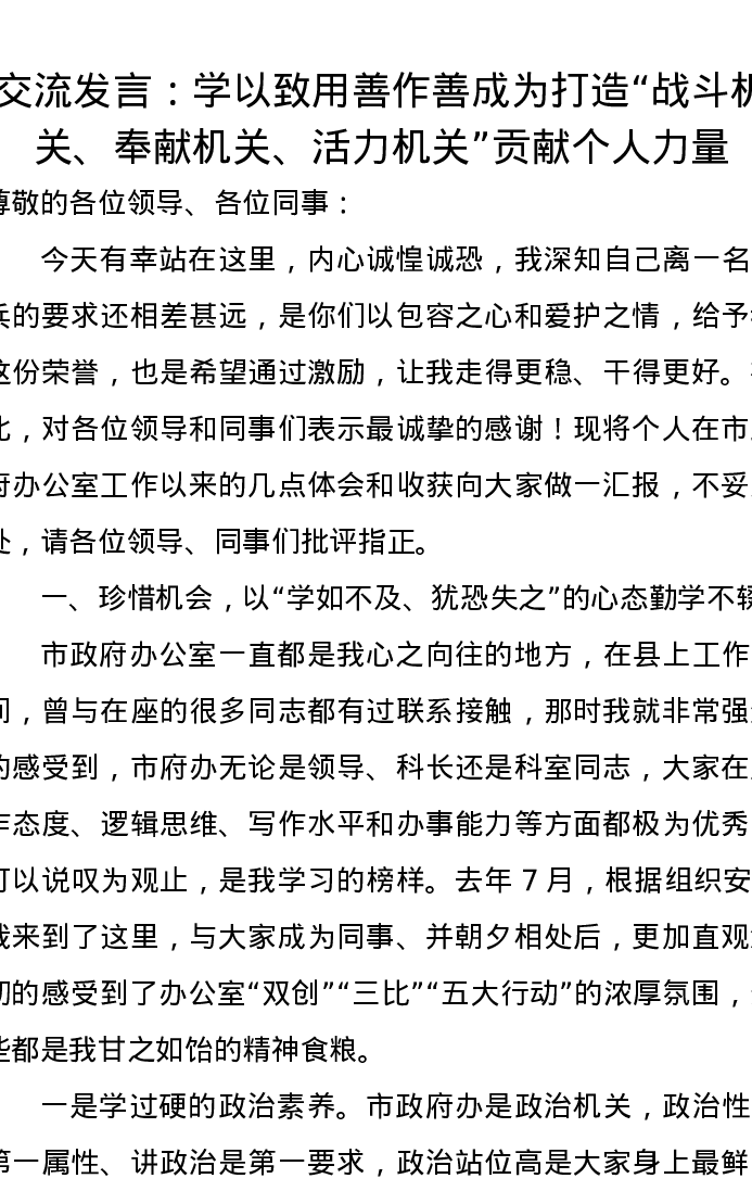 交流发言:学以致用善作善成为打造“战斗机关、奉献机关、活力机关”贡献个人力量