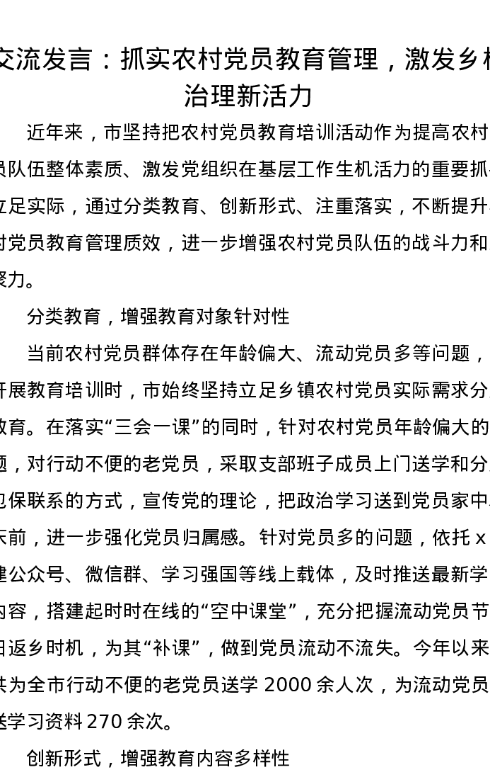 交流发言:抓实农村党员教育管理,激发乡村治理新活力
