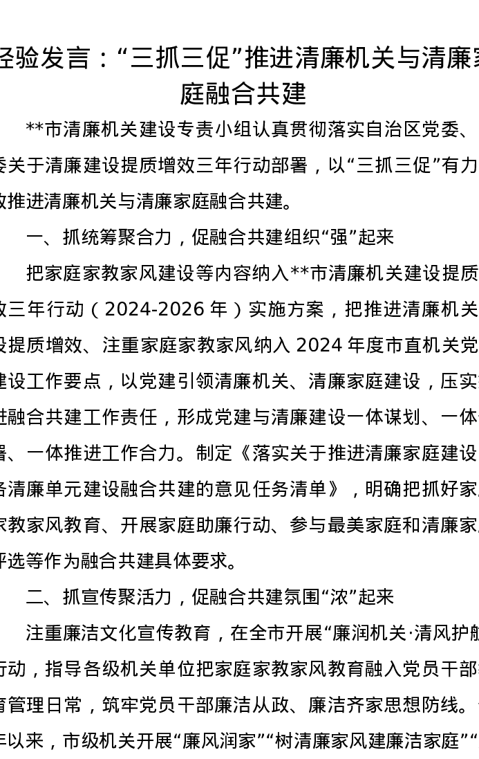 经验发言:“三抓三促”,推进清廉机关与清廉家庭融合共建