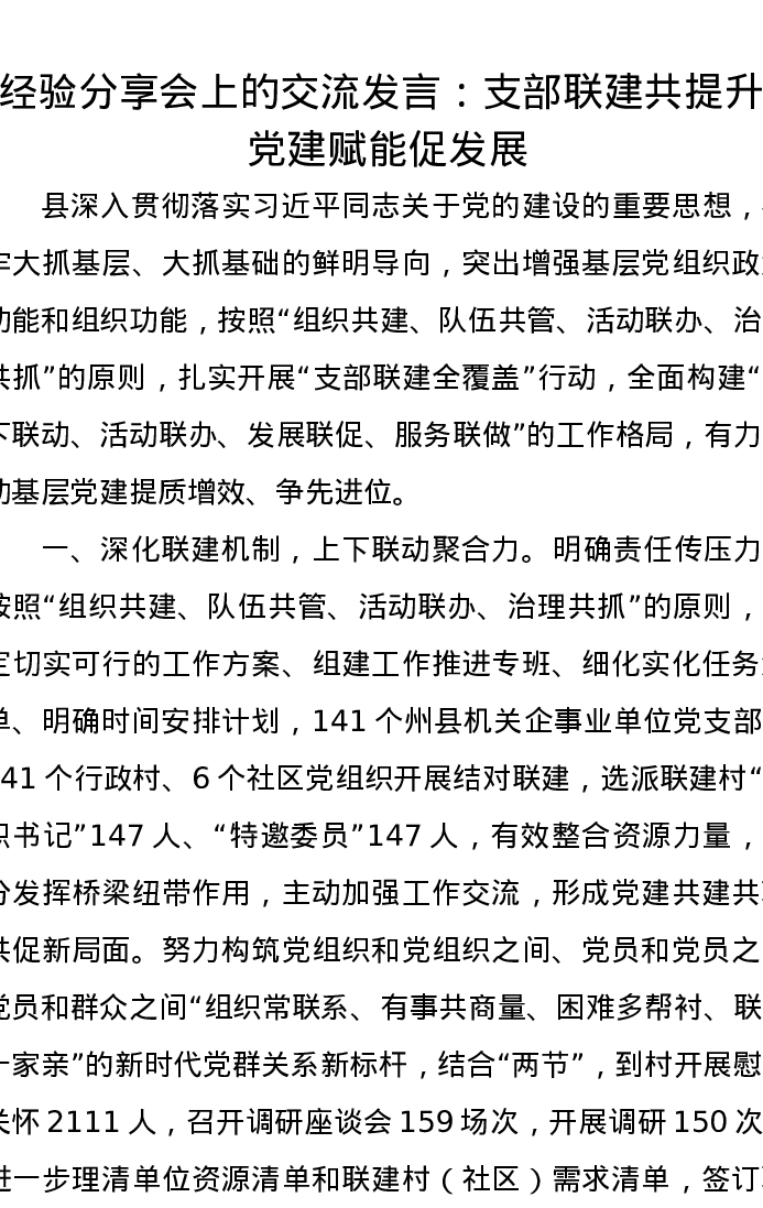 经验分享会上的交流发言:支部联建共提升党建赋能促发展