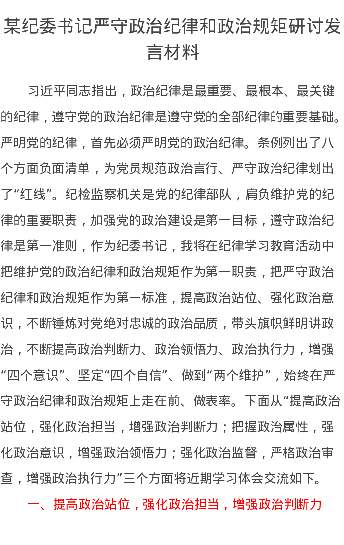 某纪委书记严守政治纪律和政治规矩研讨发言材料