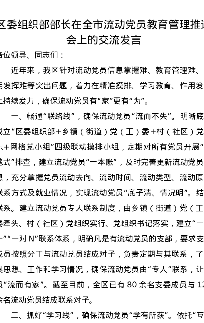 区委组织部部长在全市流动党员教育管理推进会上的交流发言