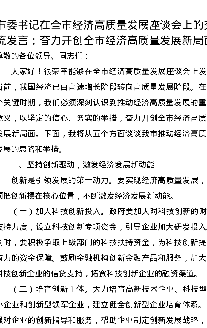 市委书记在全市经济高质量发展座谈会上的交流发言:奋力开创全市经济高质量发展新局面