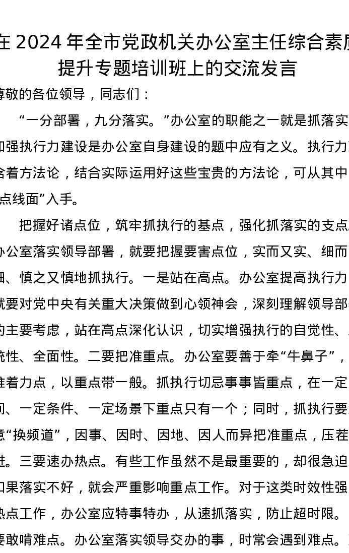 在2024年全市党政机关办公室主任综合素质提升专题培训班上的交流发言