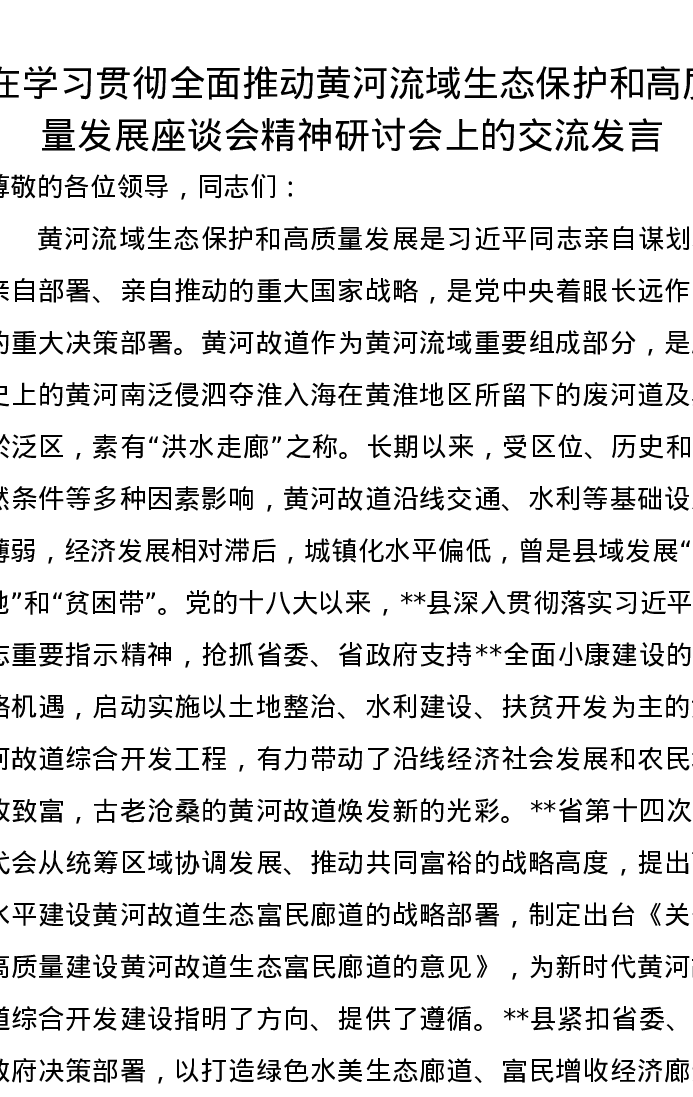 在学习贯彻全面推动黄河流域生态保护和高质量发展座谈会精神研讨会上的交流发言