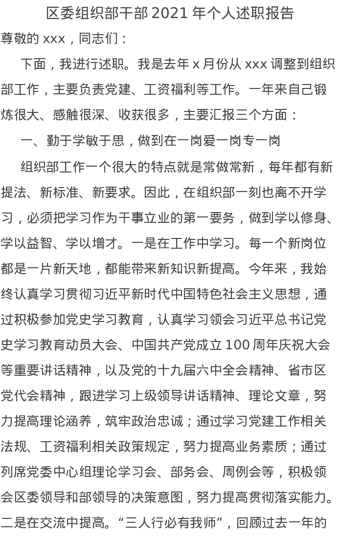 20220103区委组织部干部2021年个人述职报告