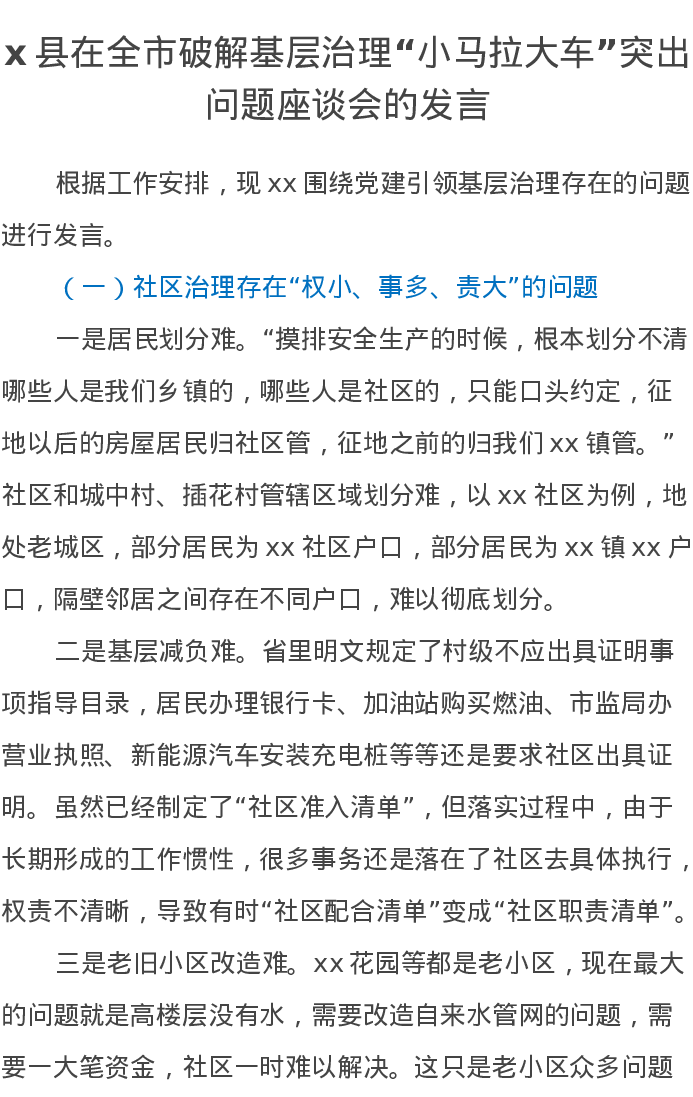 x县在全市破解基层治理“小马拉大车”突出问题座谈会的发言