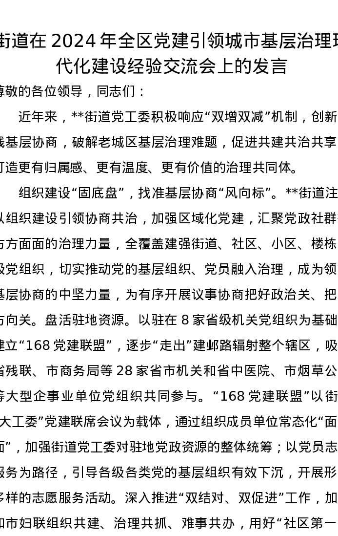 街道在2024年全区党建引领城市基层治理现代化建设经验交流会上的发言